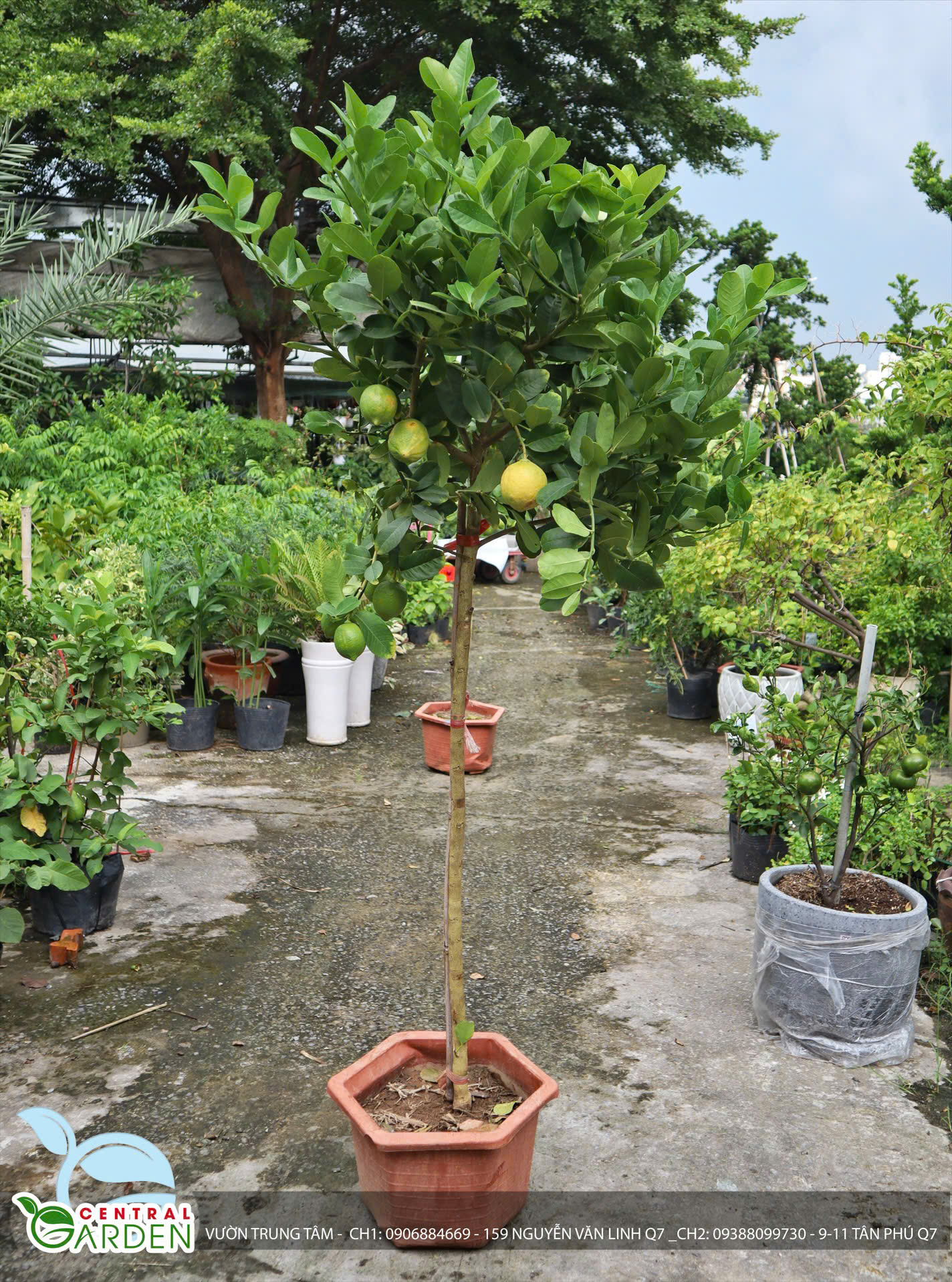 Cây đạt chiều cao 1m5, thân 1 cốt, tàn xoè tròn, đẹp như hình. Dạng cây này đã cho trái ổn định và nuôi trong chậu từ bé, đã thích nghi tốt với khí hậu nắng nóng TP.HCM, không ngại hiện tượng sốc khí hậu như dòng cây nhập khẩu.