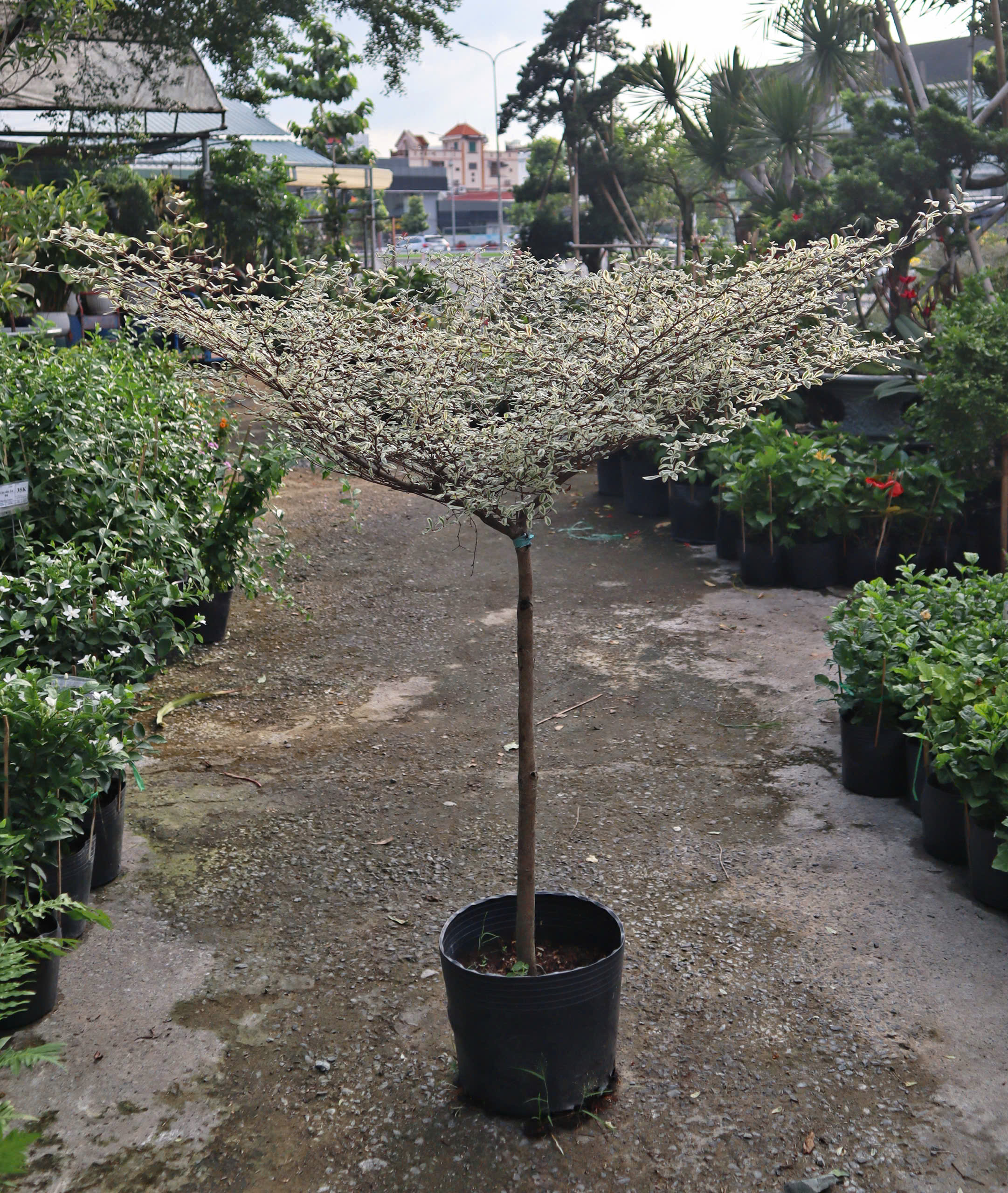 Cây thân gỗ, đơn thân, chiều cao trung bình khi trưởng thành 10-20m. Cắt tỉa để khống chế chiều cao theo yêu cầu. Cây phân nhiều cành và có lá dạng quạt ba tiêu và hình trái tim, có màu sắc đan xen giữa trắng và xanh như cẩm thạch.