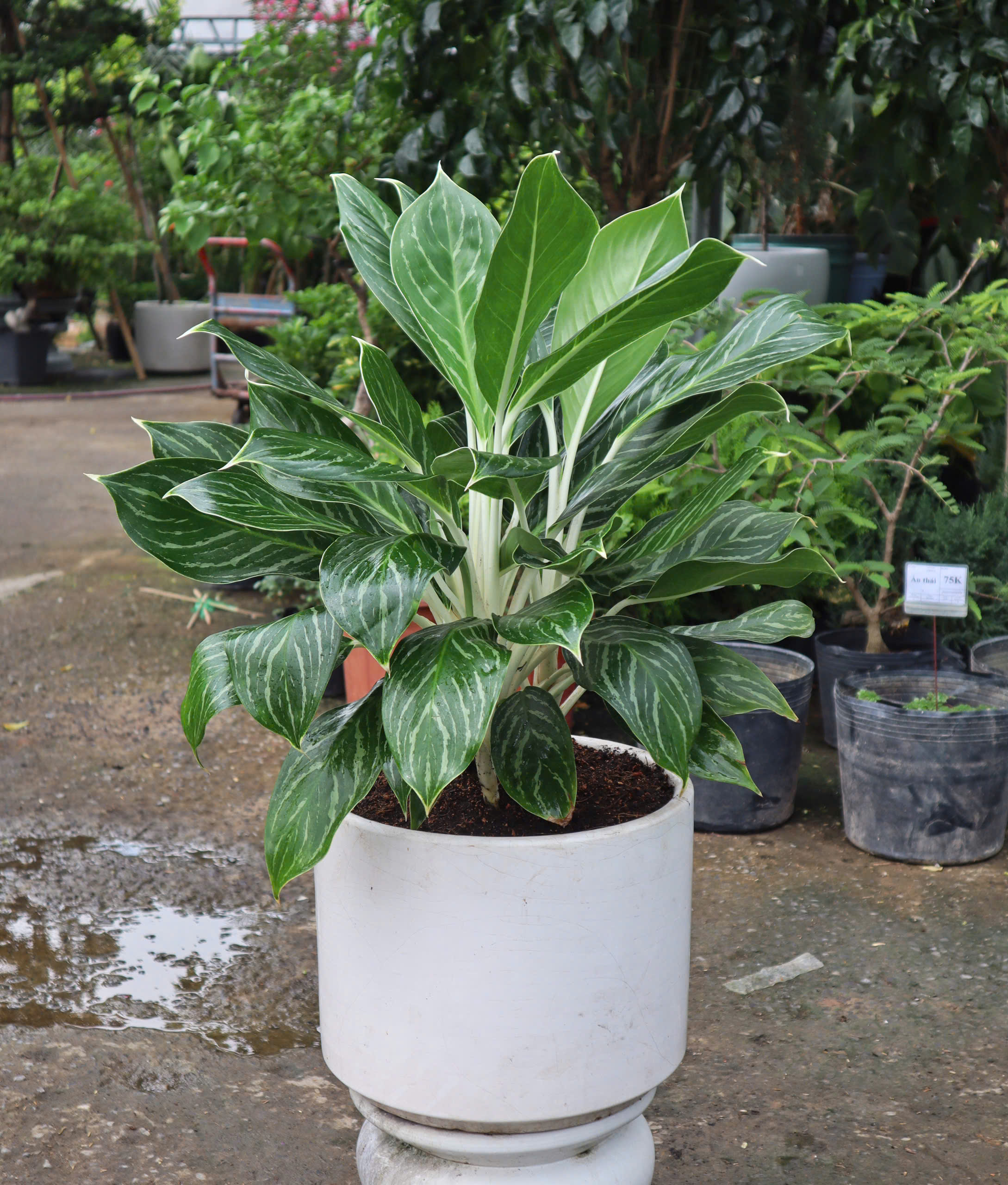 Lá màu xanh đậm ở trên, nhạt hơn phía dưới, hình bầu dục hơi tròn, nhọn ở đầu với các lá màu trắng mọc trên cuống lá dài. Lá có vẻ đẹp, mềm mại, mọng nước. Cây ít rụng lá.